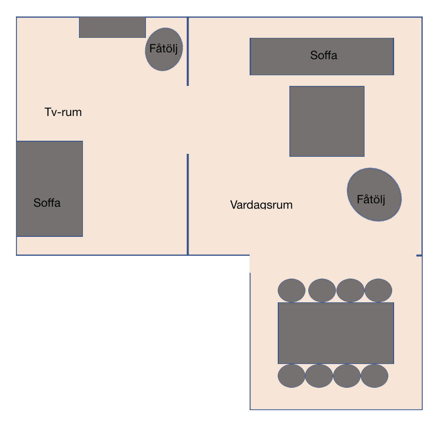 Såhär ser det ut idag. Tv-rum till vänster, vardagsrum med matsal till höger. Matsalen, eller snarare matplatsen, känns lite för trång för social distansering, så vi flyttar in den till tv-rummet istället där vi kan förlänga matbordet med ett par meter. Soffan i tv-rummet flyttar vi till matbordets ursprungliga plats och på så vis får vi två soffgrupper i samma rum med ca 8 meters mellanrum. Vi fyller också på med två extra fåtöljer mitt emellan för ytterligare ”isolerade” sittplatser. Möbleringen blir då istället såhär.