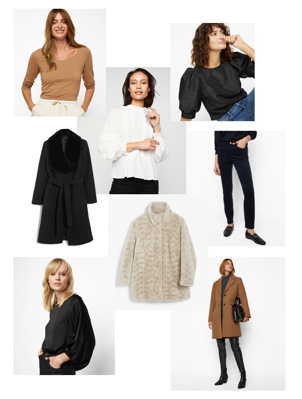 Svart kappa i ullmix här // vit blus här // svart blus med puffärm här // svart långärmad viskosblus här // fuskpälsjacka här // matnchesterbyxor här // beige/kamel-färgad kappa här // beige bastopp här