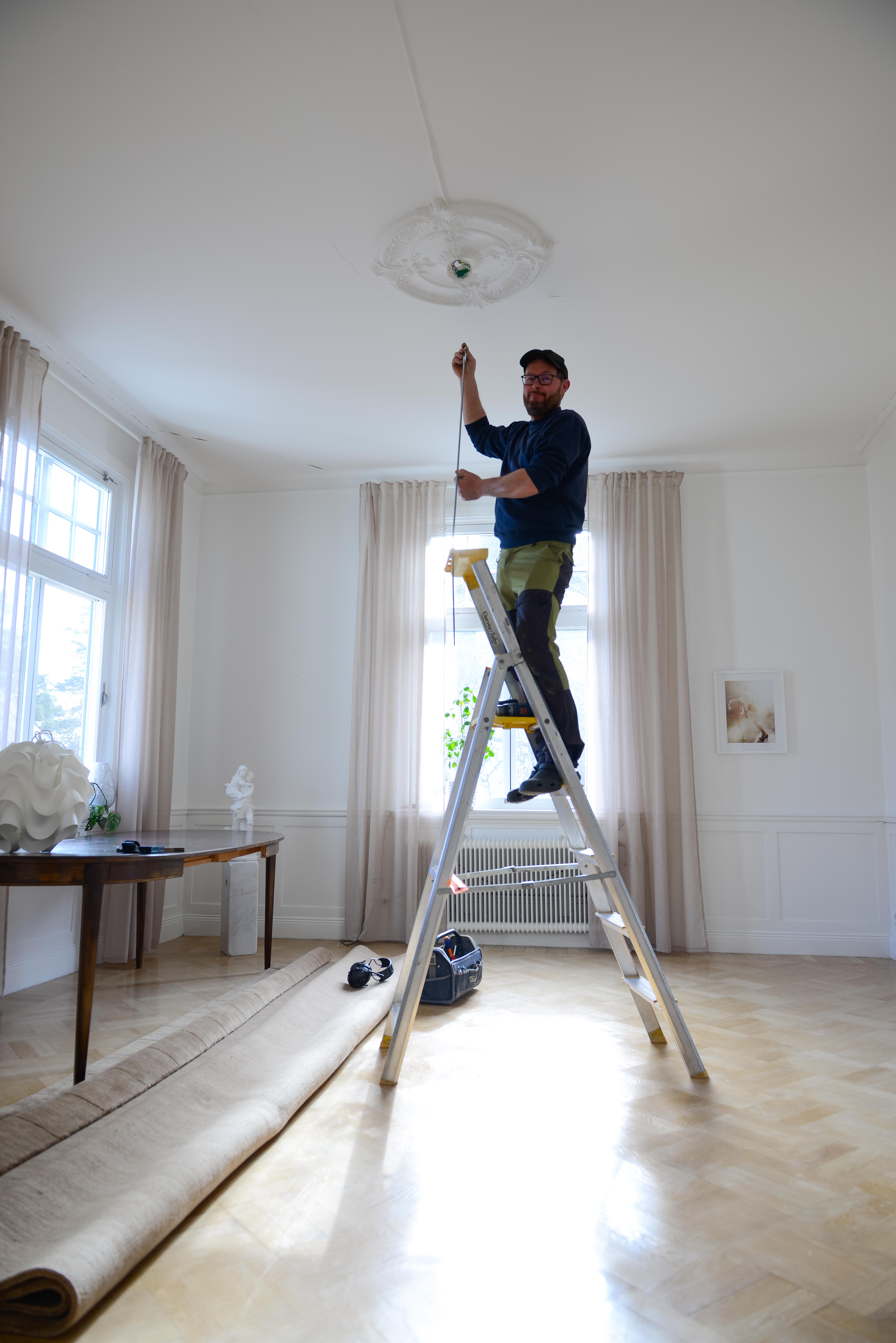 Jag har diskat varje glasrör innan upphängning och jag kan lova er att vi hade små frigolitbitar utspridda i hela huset innan jag var klar. Lampan väger lika mycket som Tilda 13 år och elektrikern fick sätta en skruv i taket som går genom hela bjälklaget upp till rummet på våning 2 där trappan till vinden är. Där är den förankrad i golvet.