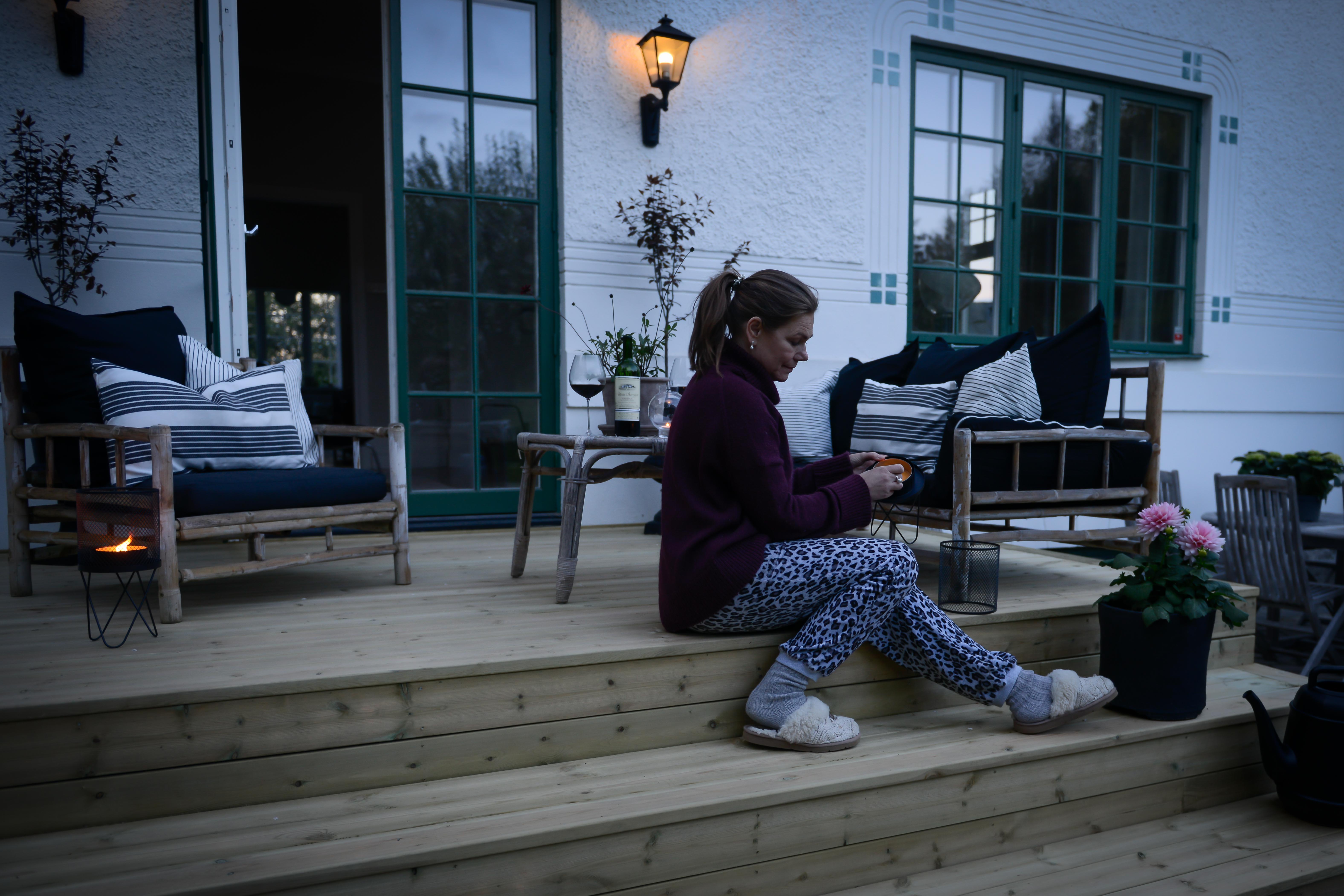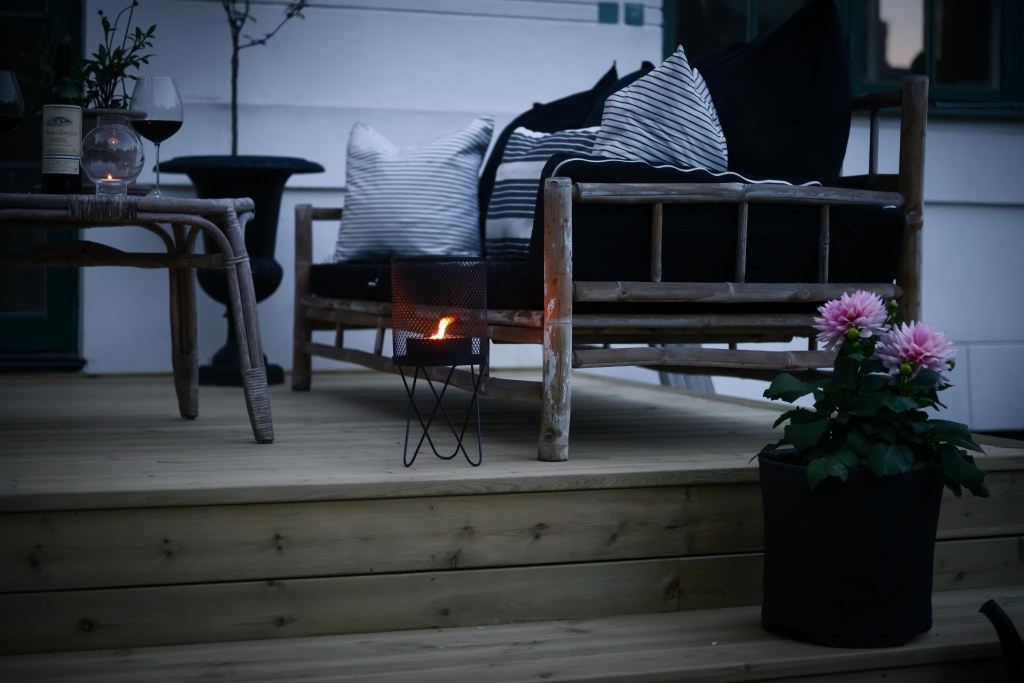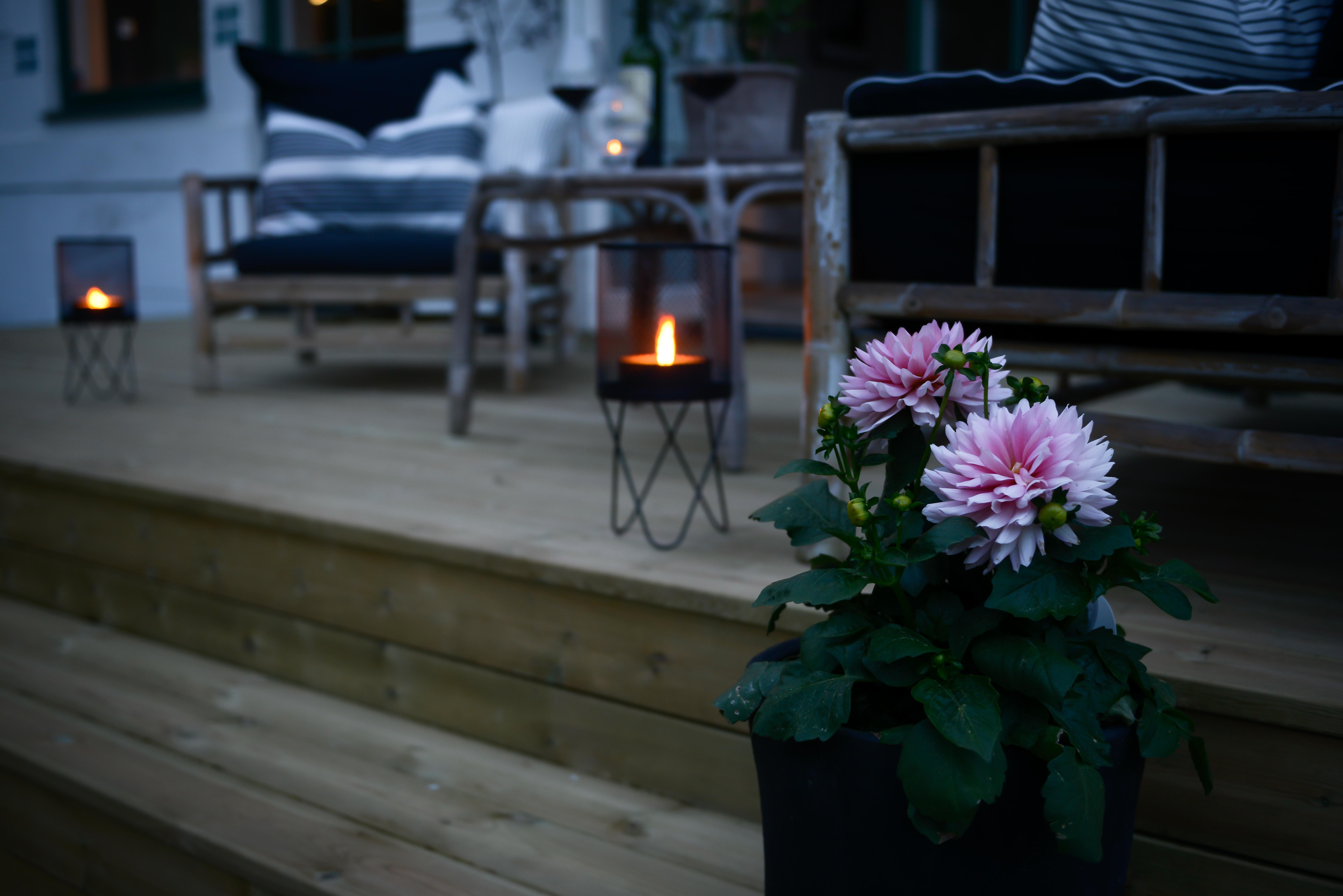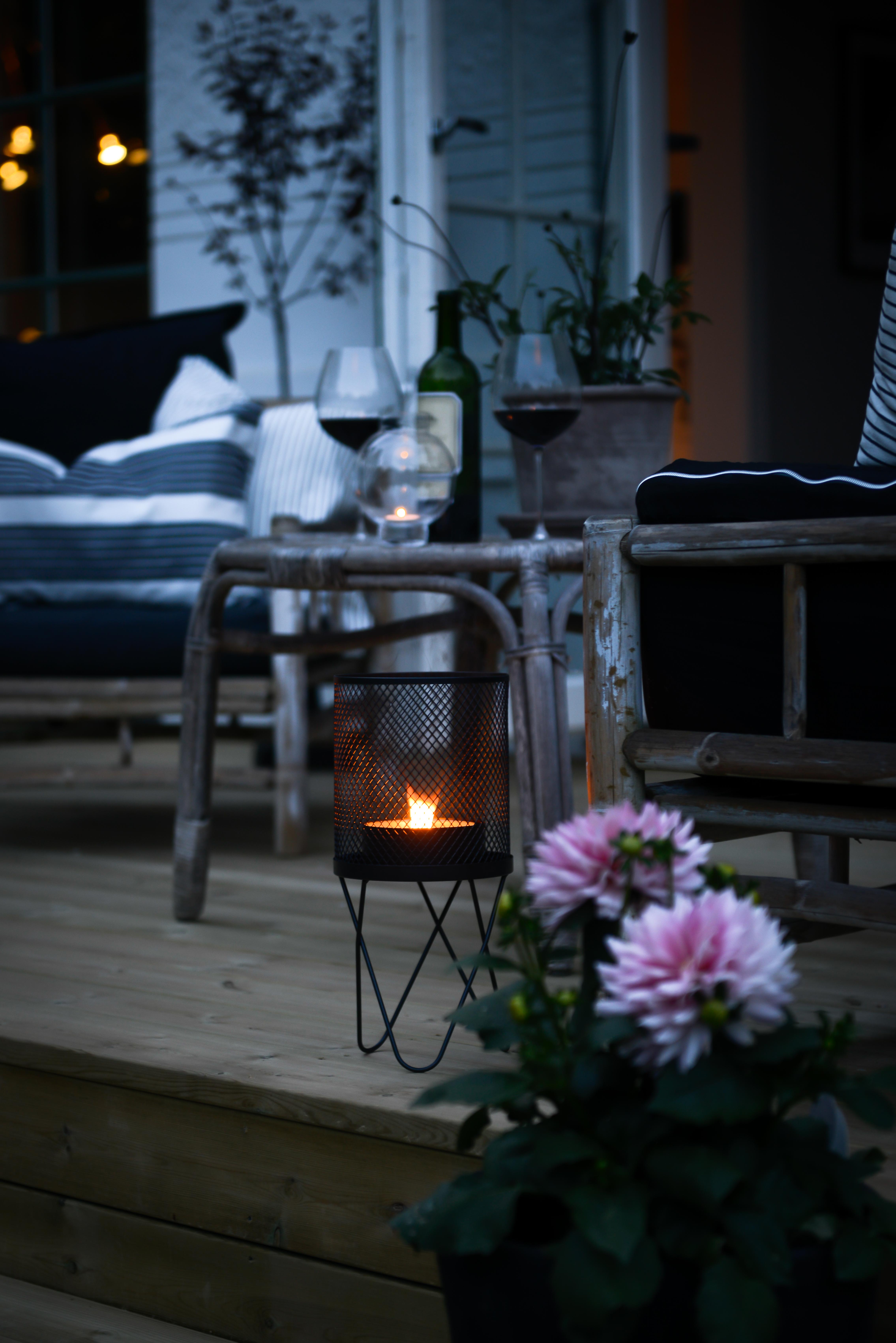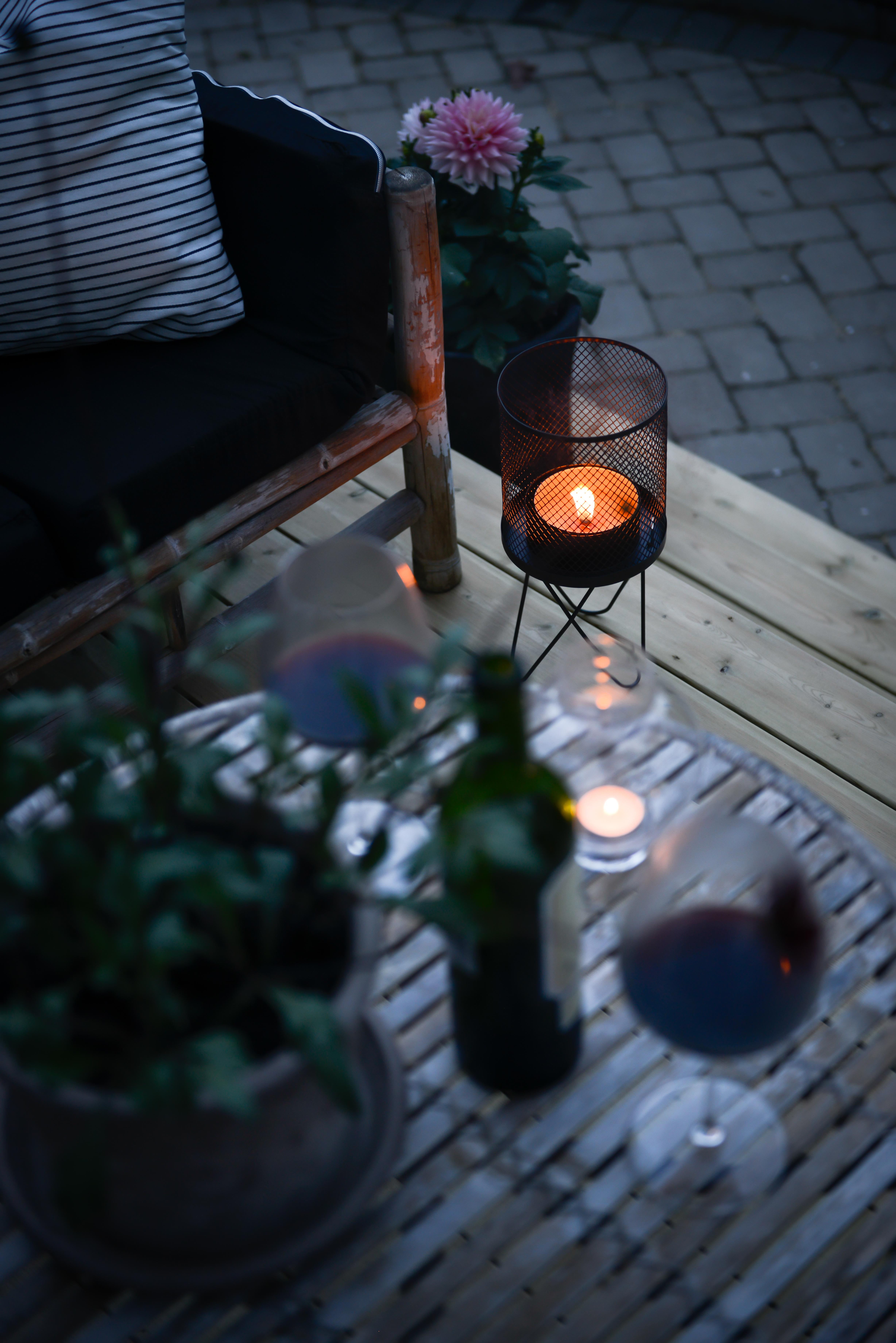 Värmen lyser med sin frånvaro denna vår, men vi ska banne mig använda terassen ändå tänker jag. Som jag har längtat efter att få fixat på baksidan av huset. I år slog vi till och tog tag i det vi tänkt på så länge. Nu har vi en härlig altan där. En skön plats ute att fixa till med mysiga kuddar, filtar, krukor, växter och inte minst belysning. Vem gillar inte myset med tända ljus om fladdrar lätt i vinden? Tänk vilken underbar tid vi har framför oss, inte konstigt man vill piffa och pynta på uteplatser och balkonger.