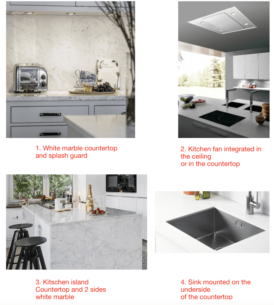 Nu kanske någon tänker att marmor är en modefluga som dör ut så småningom (kanske redan på väg), ja visst är det så, men den kommer tillbaka med jämna mellanrum. Och den har använts i inredning runt medelhavet sedan antiken, och säkert innan det också, så det känns som ett väldigt naturligt val för oss. We love it! Vi har också en rad extra önskemål gällande detaljer. Ni ser några av dem i collaget ovan.