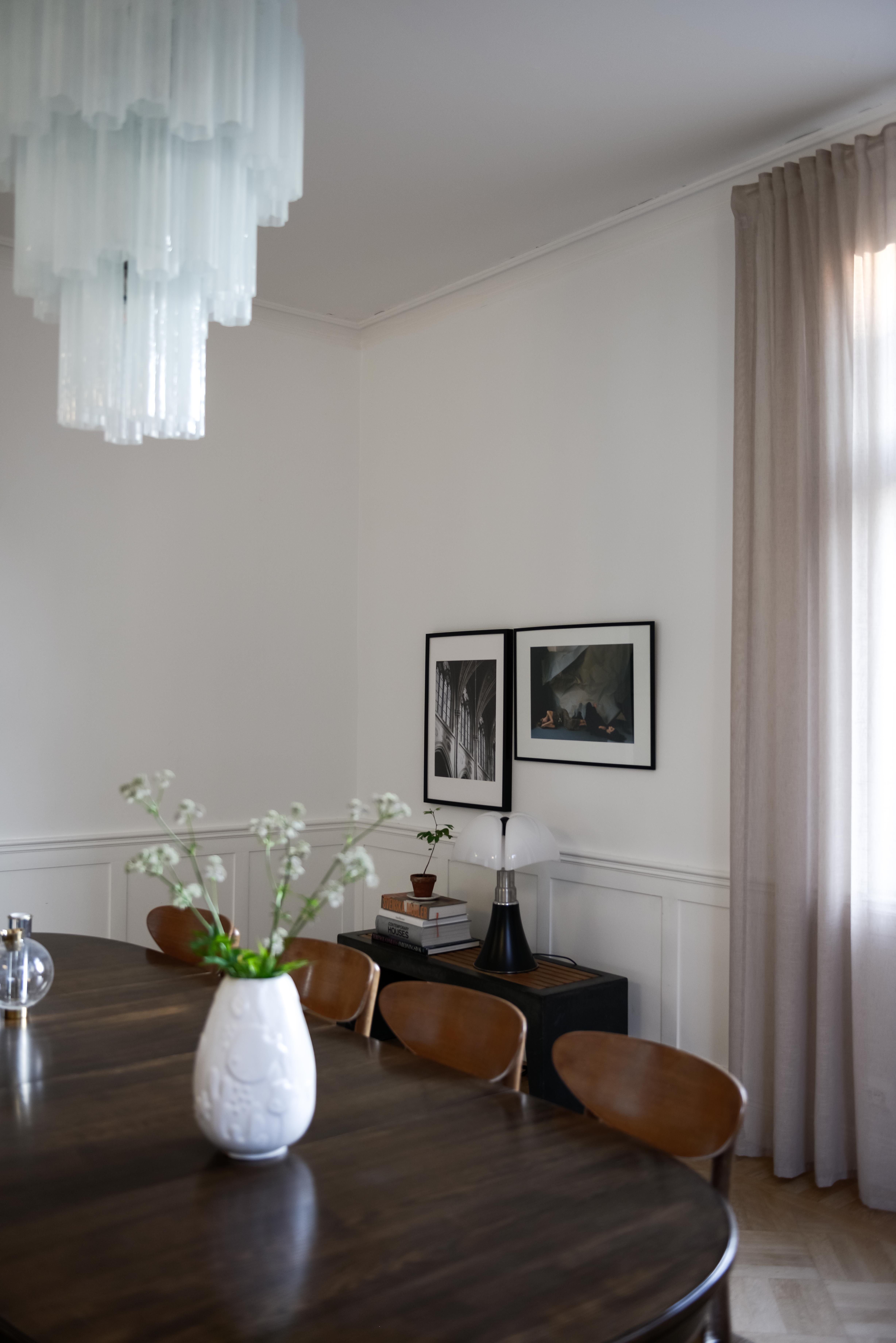 Nåväl, lite bilder från vår matsal där vi blandat högt och lågt med minnen och noga utvalda saker vi gillar. Carl Malmsten-matsalsbord från svärföräldrarnas ungdom, danska stolar från vintagebutik i Skåne, skulptur från antikaffär i Stockholm och betongbänk från Skulpturfabriken på Gotland (den hade Magnus när vi träffades). Gardinerna är från Ellos här (funderar på att köpa svarta gardinstänger), den ena tavlan, ett fotografi, har vi köpt på auktion och den andra har jag själv fotograferat på resa till Wien. Den lilla krukan i fönstret är från Nittsjö (som jag har ett speciellt förhållande till men tar det en annan gång), kaktusen i den fick vi för många år sedan av min bonus tjej Julia. Den festliga historien om hur marmorpiedestalen hamnade hemma hos oss kan ni läsa om här. Den vita keramikvasen från Upsala Ekeby har vi fått av svärfars bror och den magnifika italienska lampan i Muranoglas har vi köpt via en vintagehandlare i Stockholm. Pipistrello – bordslampan kommer från Nordiska Galleriet. Typ det enda som är nytt här kom jag på nu 🙂