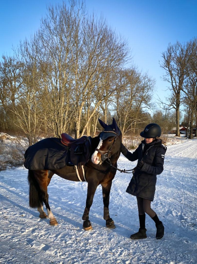 På förmiddagen var det krispigt vitt och rejält kallt, men solen sken härligt så efter hoppningen tog vi en promenad runt gården. Det gäller bara att klä sig ordentligt så är det riktigt skönt att vara ute. Så glad åt vår fina ponny och all tid vi får tillsammans Tilda och jag. Varenda dag hänger vi i stallet hon och jag 🙂