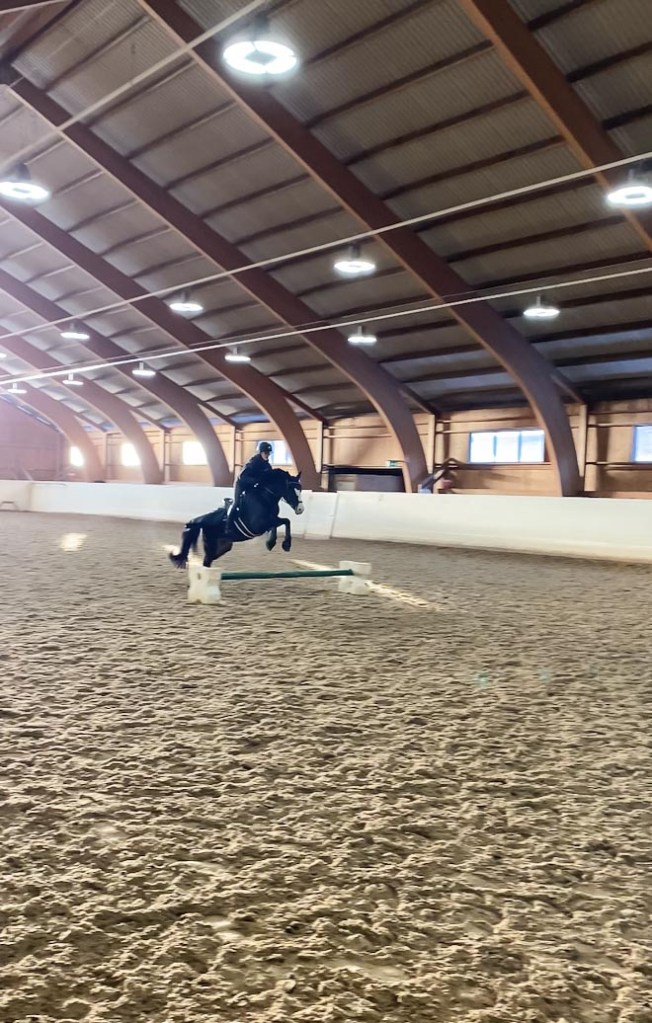 Tilda och jag var uppe redan vid 9.00 i morse, vi hade kommit överens med Maya i stallet om att hoppa. Maya är duktig och erfaren och brukar hjälpa Tilda med just hoppningen. Vår ponny är bara 7 år och har inte hoppat så mycket så det är suveränt att Maya kan hjälpa till med utbildningen. Tilda har världens förtroende för Maya och vill inte hoppa om inte Maya är med.
