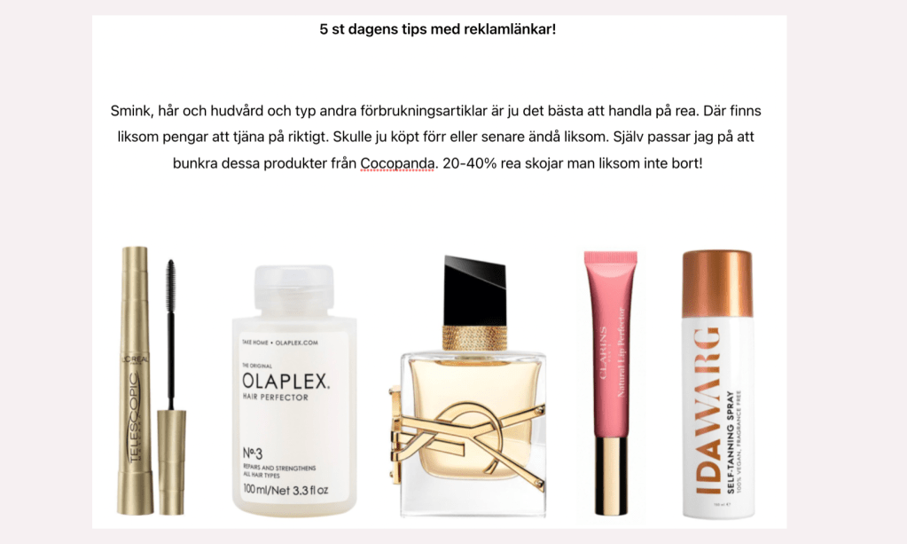 Smink, hår och hudvård och typ andra förbrukningsartiklar är ju det bästa att handla på rea. Där finns liksom pengar att tjäna på riktigt. Skulle ju köpt förr eller senare ändå liksom. Själv passar jag på att bunkra dessa produkter från Cocopanda. 20-40% rea skojar man liksom inte bort!