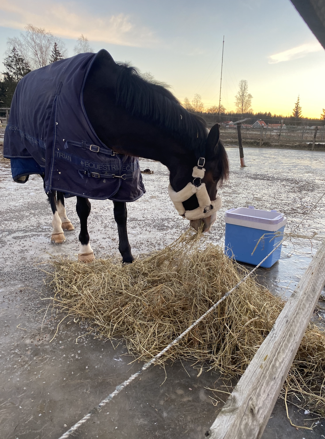 Hästarna brukar normalt sett inte få vatten i hagarna vintertid (eftersom det fryser), men efter att ha gett henne vatten i kylväskan, och upptäckt att hon druckit upp nästan allt varje dag, tänker jag att jag kommer att få lov att fortsätta med det framöver. Kunde aldrig tro att hon skulle dricka så mycket när det är så kallt och snöigt osv… Bäst hade såklart varit att köpa en värmebalja (här), men jag tror inte att man får koppla den till elen på gården, så kylväskan får lov att bli ett helt ok alternativ.