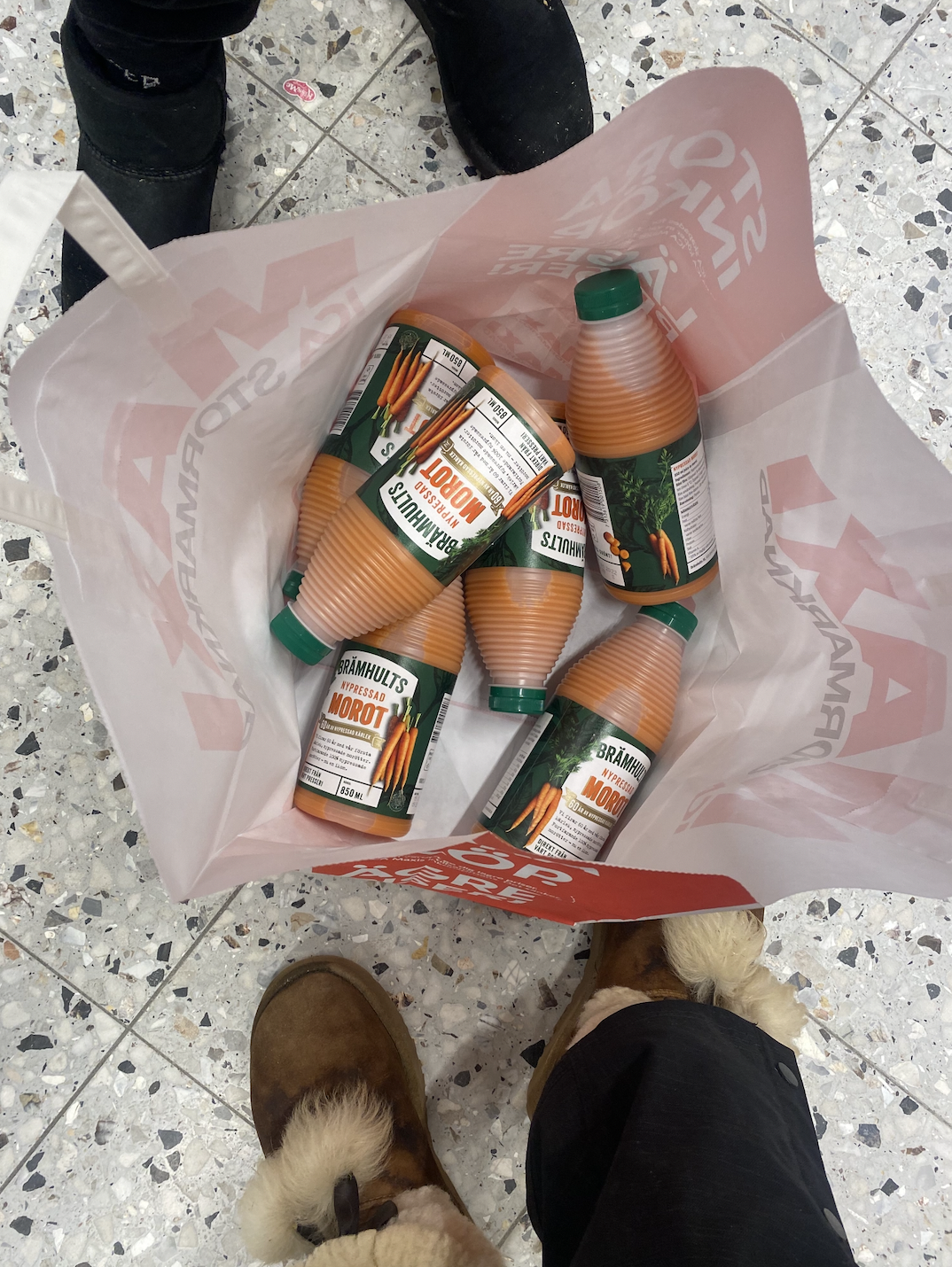 En annan utmaning när man har en sjuk häst är att se till att den äter och dricker ordentligt. Man får helt enkelt försöka ”lura i dem” vätska så gott det går om de dricker lite taffligt. Vi kom på den briljanta idén att ge Iia morotsluice och äppeljuice. Morotsjuicen, den färskpressade från Brämhults, blev en stor favorit och hon drack mååånga liter under några dagar. Köpte den här suveräna foderskålen i gummi och serverade i. Bästa krubban är det, och nu får hon allt foder i den. Tänk själv, mest naturligt för hästen är ju att äta från marken, inte från en krubba högt upp på väggen.