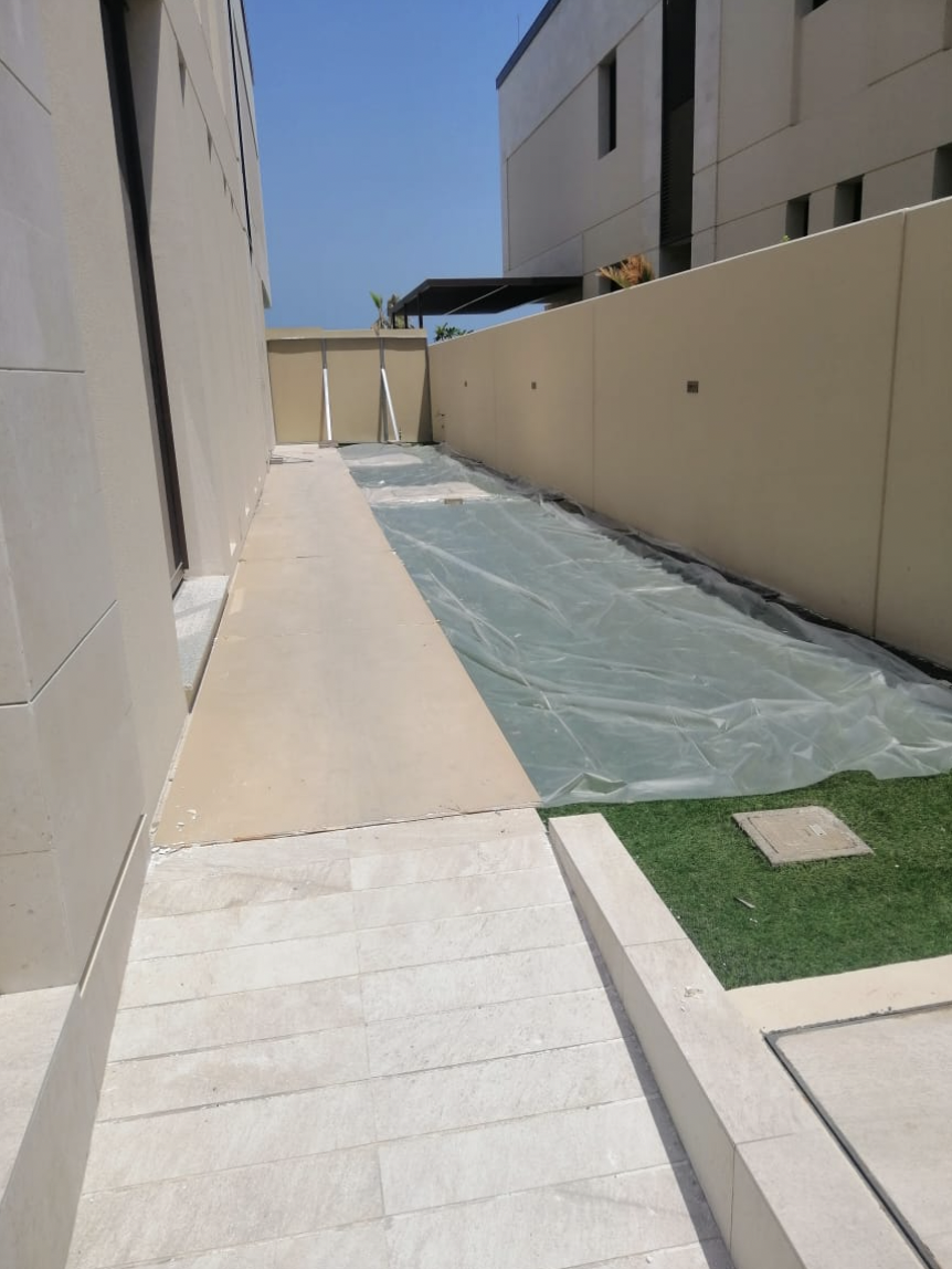 Trädäcket var heller ingen lek. Vanligt trä går inte. Inget går att bygga i trä där nere förresten, så vi fick specialbeställa en slags bambuplank i en specialfärg. Ville ju ha det grått. En morgon fick jag bilder från hantverkarna där nere. De hade lagt en stor del av däcket och ville visa. Problemet var bara att de lagt ändskarvarna i en rak linje efter varandra. Såg inte klokt ut… Det tog mig typ en timme att via zoom, försöka få dem att lägga skarvaran lite utspritt i ett ickemönster. Det var otroligt svårt för dem att inte tänka symmetriskt. De trodde väl att jag var galen. Efter att vi hade jobbat ihop i ungefär ett år, började de förstå mig, eller de började förstå att de aldrig skulle förstå mig, så det var bäst att inte tänka själva ut att fråga om detaljerna istället för att bara göra som de brukar. Man kanske inte tänker på sådant om man inte jobbar med det. Men i princip allt är annorlunda från material till byggteknik, till dränering, etc etc. Plattor läggs liksom inte bara på sand som de gör här i Sverige, de cementeras fast i formar. Samma med gräsmattor och rabatter. Det är också liksom gjutna formar under. Så att bara gräva upp belysning tex som hamnat fel i en rabatt, det går icke! Den är ju liksom fastgjuten i backen… .
