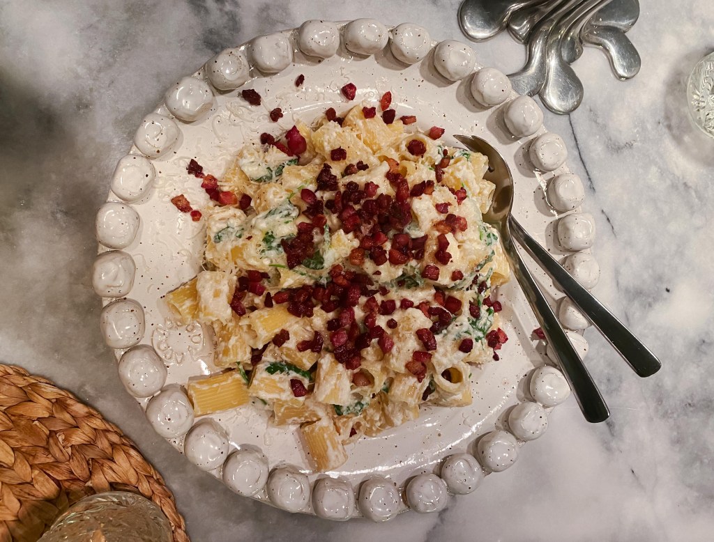 Koka pasta, helst rigatoni eller tortiglioni, eller annan lite ”större penne”. Blanda 1 burk ricotta, citronzest (yttersta skalet på en ekologisk citron) från 2 citroner, samt 2 dl riven parmesanost i en kastrull. Koka upp och smaka av med salt och peppar. Späd med ca 1 dl pastavatten. Blanda pasta med ruccola och ostsåsen, strö över finriven parmesanost och toppa med knaperstekt pancetta eller tärnad bacon.
